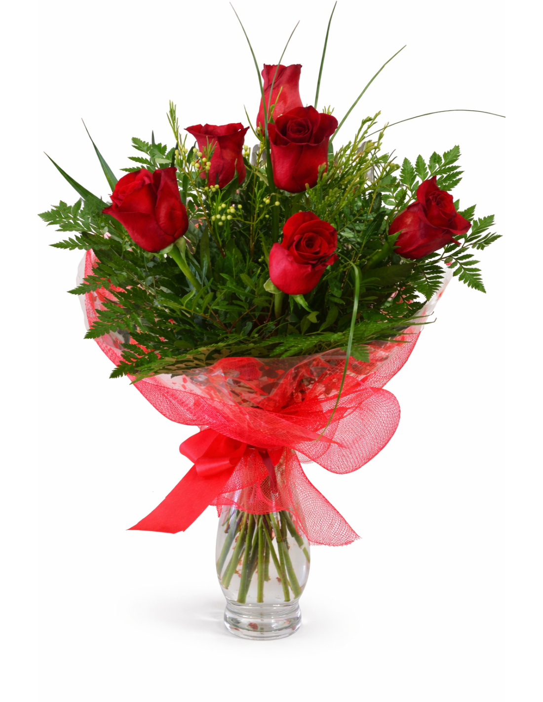 Ramo 6 rosas rojas + jarrón de cristal