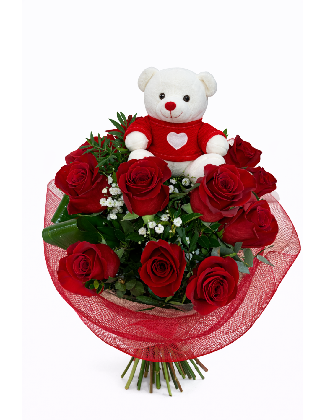 Ramo de 12 rosas rojas, blancas o variadas con peluche amoroso (El peluche puede no corresponder a la imagen)